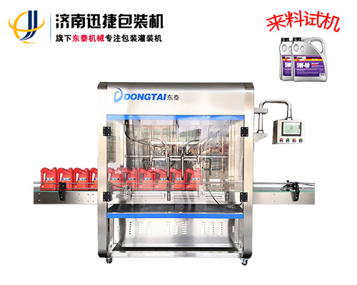 全自動潤滑油灌裝主機采用流量計的灌裝方式,一對一系統(tǒng)設計,4頭灌裝機采用4套供料系統(tǒng)單灌裝主機采用流量計的灌裝方式,一對一系統(tǒng)設計,每套系統(tǒng)都可單獨使用不受影響,設備可完成不同瓶型的自動定量;灌裝頭自帶回吸功能,防止油品外溢,灌裝機頂部帶有儲料箱,儲料箱內部免存料設計,儲料箱內要有高、低液位裝置,高、低液位信號要求是24V、4~20mA,由接線端子輸出。