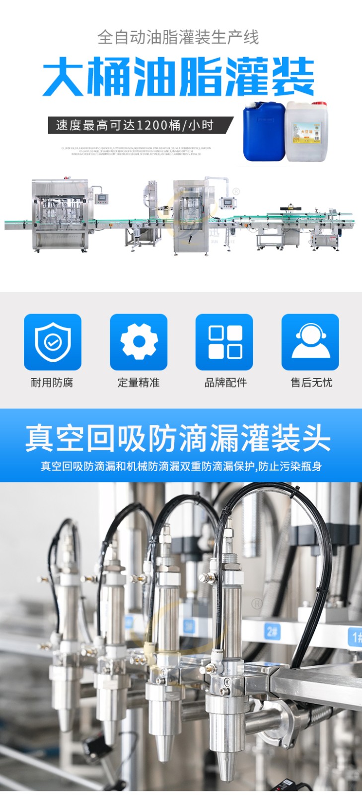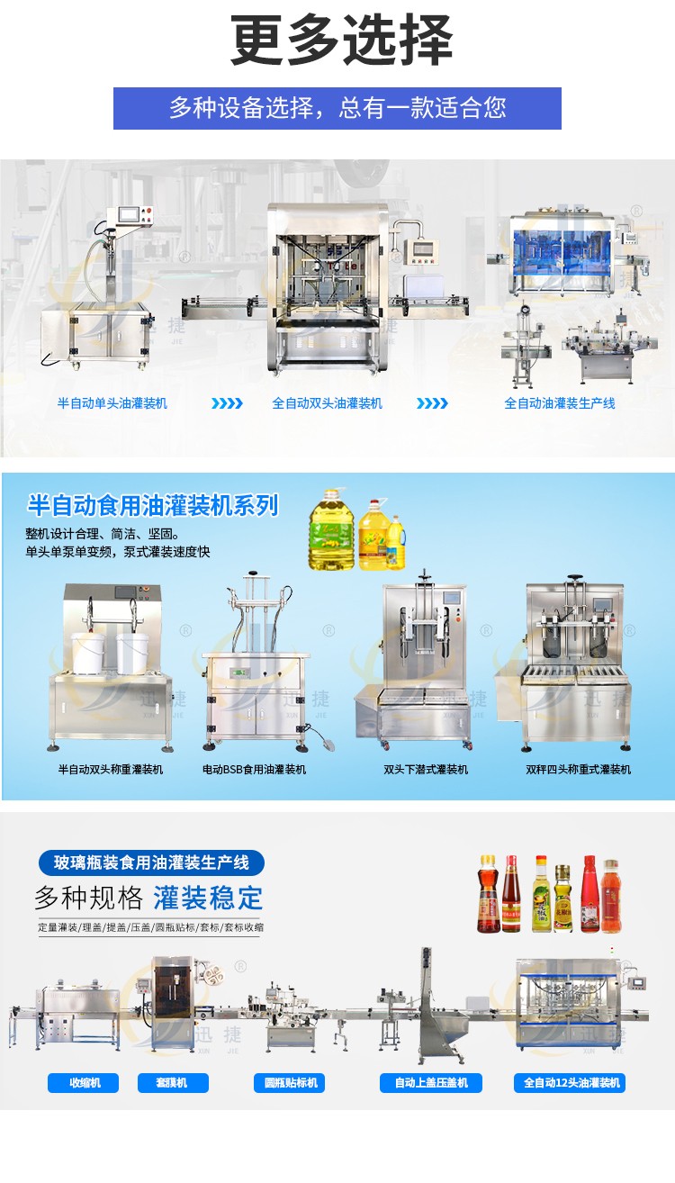 全自動(dòng)油脂灌裝生產(chǎn)線適用于灌裝各種油類(lèi)及粘稠液體,如花生油、調(diào)和油、菜籽油等食用油的灌裝??筛鶕?jù)灌裝需求定制機(jī)型。