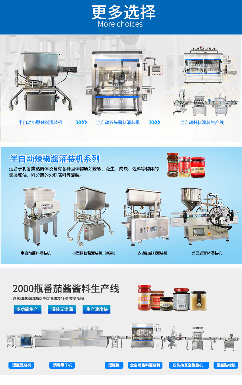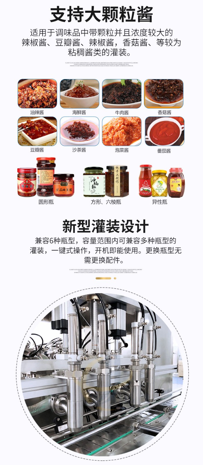 全自動四頭辣椒醬灌裝機適合中小口徑三旋、四旋玻璃瓶調味醬的分裝,適合醬料、含顆粒黏稠物料的灌裝,物料接觸部分均采用