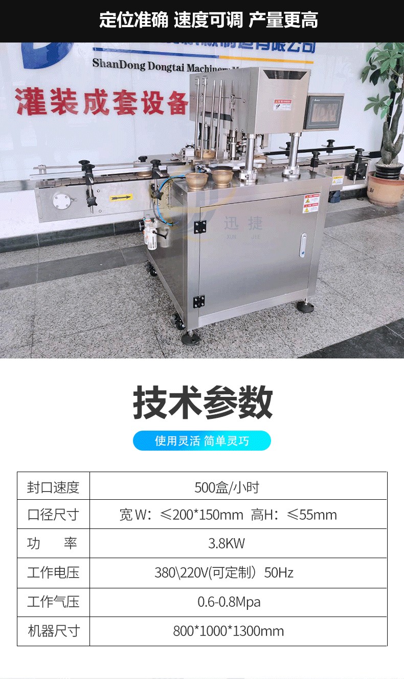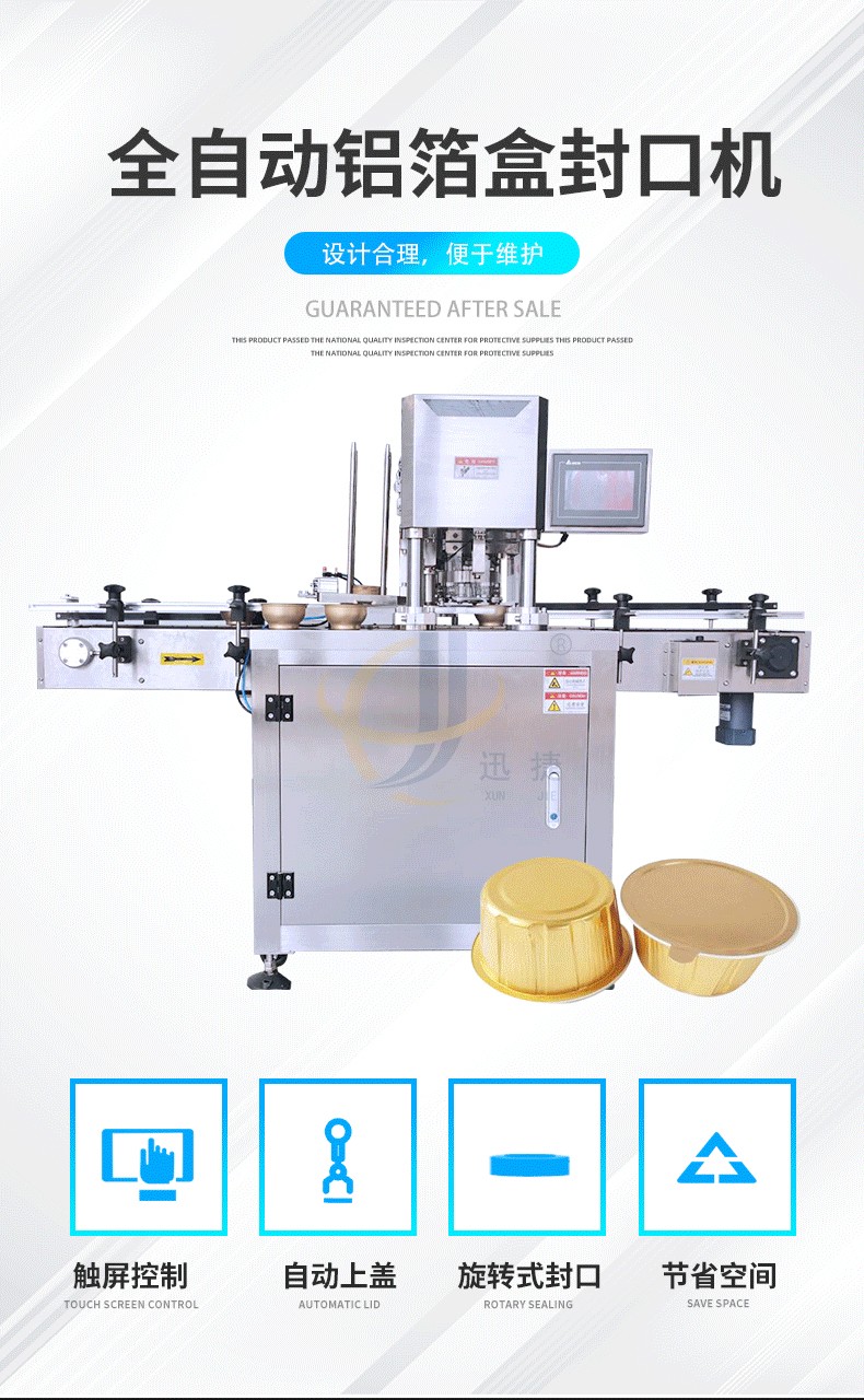 全自動鋁箔盒封口機(jī)用途:用于咖喱醬、調(diào)料品、火鍋料、果醬、辣椒醬、醬油醋、番茄醬等杯盒的自動灌裝與封口。
