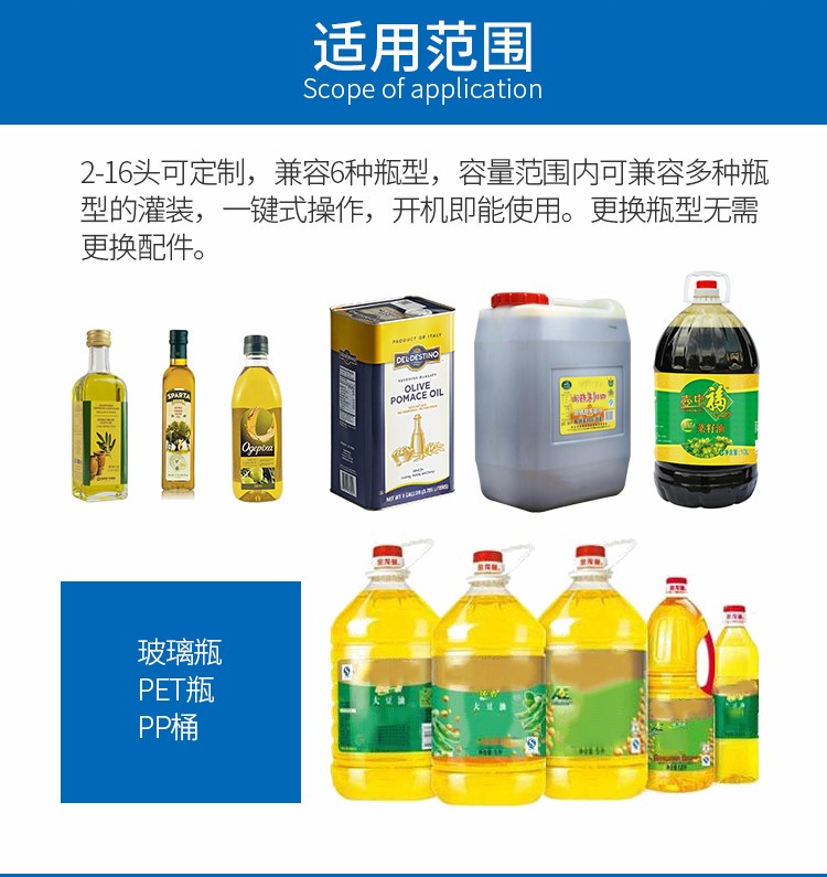 食用油灌裝生產(chǎn)線2-16頭可定制,兼容6種瓶型,容量范圍內(nèi)可兼容多種瓶型的灌裝,一鍵式操作,開(kāi)機(jī)即能使用。