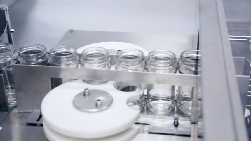 設(shè)備介紹:醬類灌裝線配套廣口玻璃瓶洗瓶機(jī)具有性能可靠、操作簡單、清洗效果良好、工作效率高等特點,主要由不銹鋼水泵、高壓噴頭、電器箱等組成。它的工作原理是先將需要清洗的瓶子裝進(jìn)瓶盤內(nèi),然后人工送入工位,通過循環(huán)水噴將需要清洗的瓶子注滿水沉至清洗槽先進(jìn)行簡單的粗洗。然后瓶子會上升推進(jìn)洗瓶機(jī)的第二工位,在第二工位會進(jìn)行三次仔細(xì)的清洗,在經(jīng)過三次氣沖、甩干,再自動進(jìn)入到滅菌烘箱。清洗過程為粗洗一次,仔細(xì)清洗三次,然后是烘干。