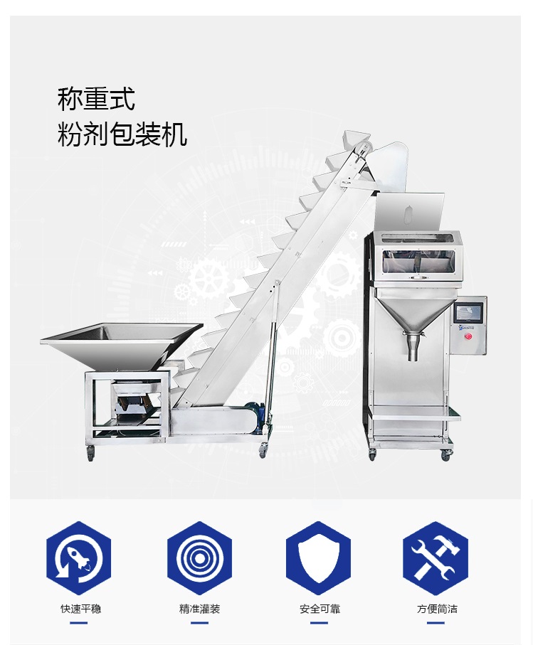 該稱(chēng)重包裝機(jī)適用于農(nóng)藥、飼料、添加劑、洗衣粉、食鹽、味精、白糖、種子、大米等顆粒粉狀物料的定量稱(chēng)重包裝。