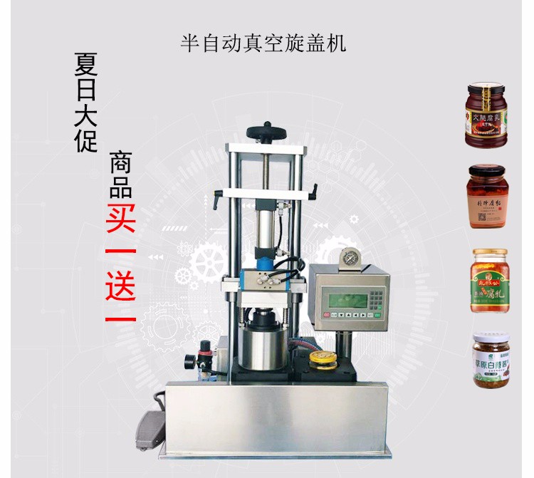 這款小型辣椒醬封口機(jī)主要用于食品包裝,采用標(biāo)準(zhǔn)馬口鐵爪式旋開蓋封口的玻璃瓶包裝??蓪?shí)現(xiàn)的功能是抽吸包裝容器內(nèi)的空氣使其達(dá)到設(shè)定的負(fù)壓值(即抽真空),然后旋緊蓋子。 為半自動(dòng)機(jī)型,即人工進(jìn)出瓶,人工配蓋,其他過程自動(dòng)。