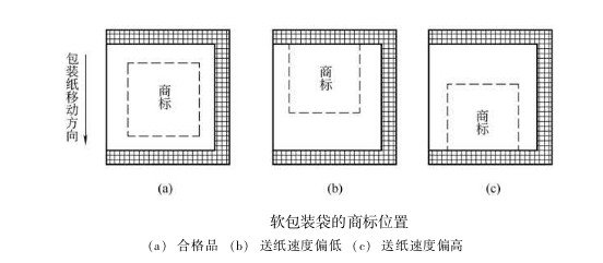 在包裝作業(yè)過程中,卷筒半徑逐漸減小,包裝紙所受張力發(fā)生變化,送紙輥與包裝紙之間的摩擦因數(shù)受環(huán)境溫濕度的影響而發(fā)生波動,加上商標(biāo)印刷誤差,以及送紙、縱封、橫封、切斷各部分速度的差異等因素,使得刀輥的實際切線偏離規(guī)定部位。即使這種位置誤差很小,例如在某—包裝袋上只偏差0.1mm,但包裝機速度很快,有的高達200包/min, 如不加以控制調(diào)節(jié),機器運行1垃i六 后,誤差積累可達20mm,切線嚴(yán)重偏離規(guī)定部位,降低了包裝質(zhì)量,甚至造成廢品。如圖所示,圖(a)為合格品; 圖 (b) 為送紙速度偏低,商標(biāo)后移; 圖 (c) 為送紙速度偏高, 商標(biāo)前移。 為了保證包裝袋的正確封切, 必須在卷筒紙供送系統(tǒng)中, 引人商標(biāo)圖案自動位置檢測與控制系統(tǒng)。目前應(yīng)用廣泛的是光電自動定位系統(tǒng)。